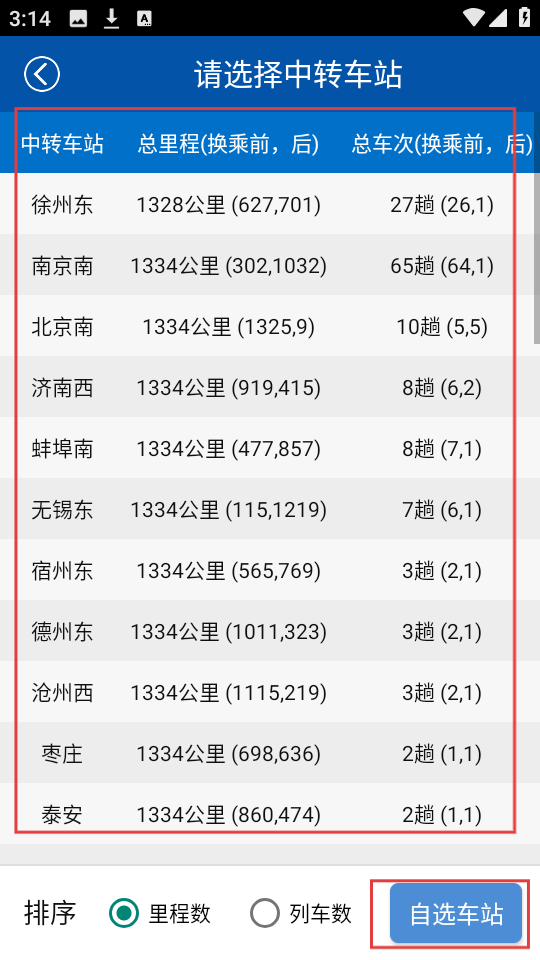 3、进入请选择中转车站页面,能看到众多中转车站选项,可根据总里程、总车次等信息来挑选合适的中转车站。