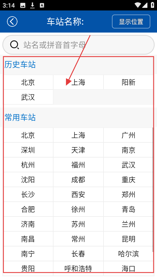 4、要是对系统推荐的中转车站不满意,点击【自选车站】,可在历史车站、常用车站里选择,或者通过搜索来选定心仪的车站。