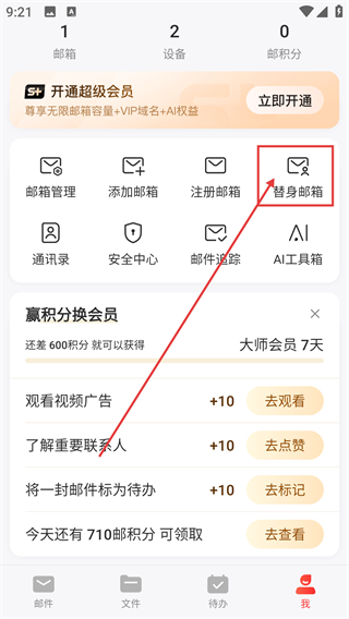 2、进入个人中心后,点击【替身邮箱】选项,就能进入替身邮箱的管理操作界面哦。