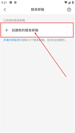 3、在替身邮箱页,点击【创建新的替身邮箱】按钮,就能进入主邮箱选择的配置页面啦。