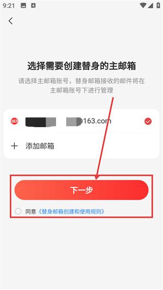 4、选好主邮箱后,勾选协议并点击【下一步】,就能继续完成替身邮箱的创建流程啦。