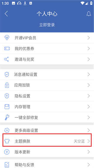 2、进入个人中心后点击【主题换肤】选项,就能跳转到主题换肤页面,准备更换应用主题啦。