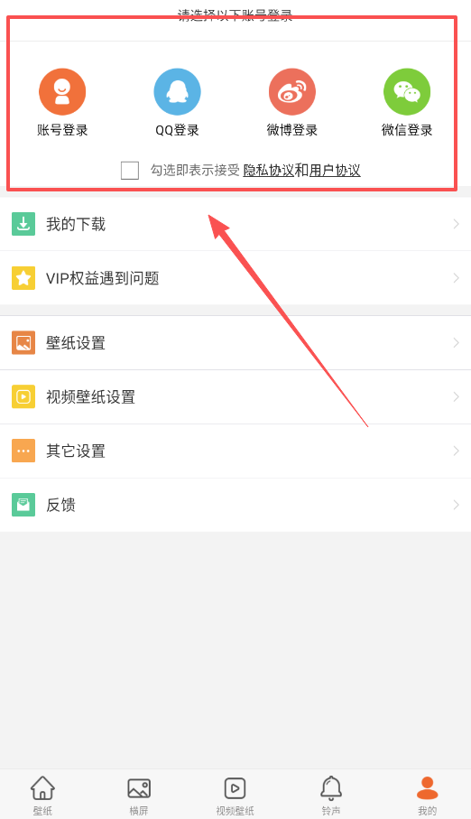 1、首先打开软件,你可以选择用账号、qq、微博或微信快速登录,记得勾选同意隐私和用户协议哦,方便你快速找到喜欢的风格。