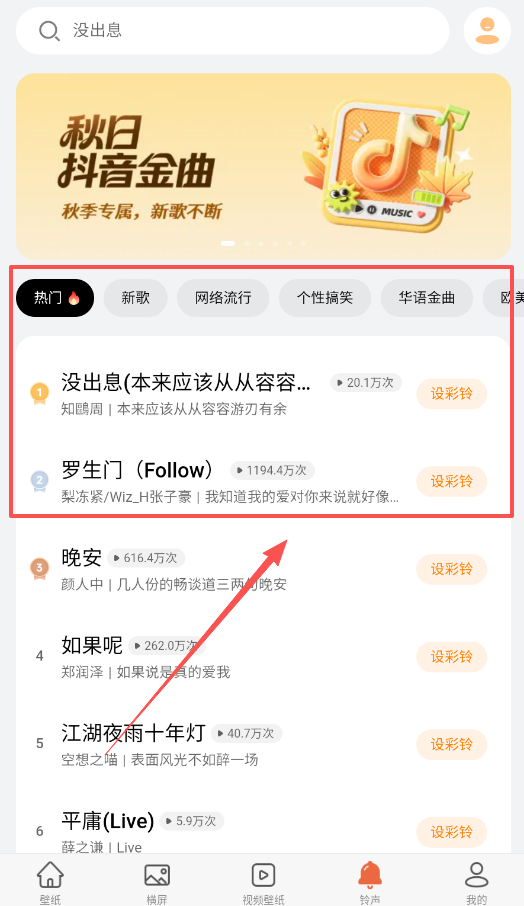 3、如果你还喜欢换铃声,切换到铃声板块,那里有秋日抖音金曲等热门分类,比如没出息、罗生门等歌曲,但能帮你发现很多流行音乐。