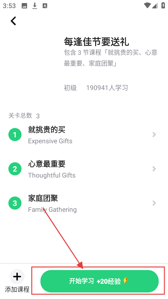 2、进入课程详情页,能看到课程包含的关卡,若要开始学习,点击【开始学习+20经验】哦。