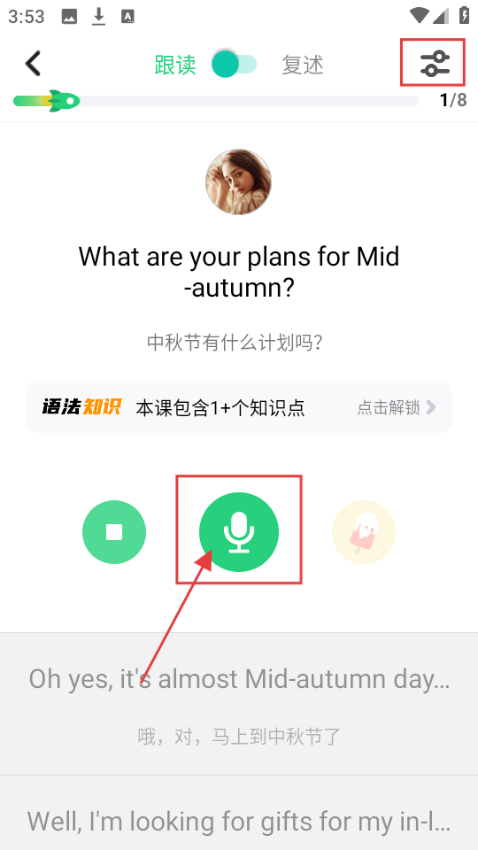 3、进入学习页面,能看到英语内容和中文翻译,若要进行跟读练习,点击麦克风图标呀。