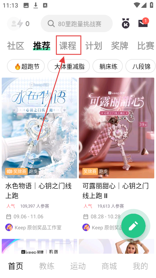 1、我们进入Keep软件,能看到社区、推荐等板块,若要找健身课程,点击【课程】吧。