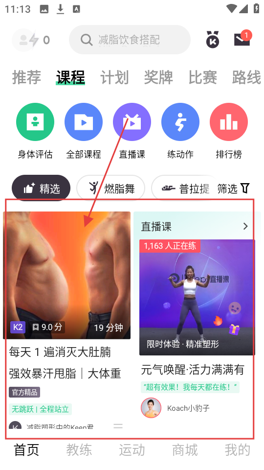 2、进入课程页面,能看到身体评估、全部课程等选项,若想选减脂类课程,点击对应课程卡片哦。