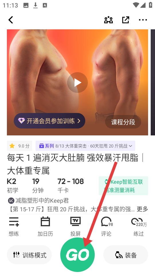 3、进入课程详情页,能看到课程介绍等内容,若要开始训练,点击【GO】按钮呀。