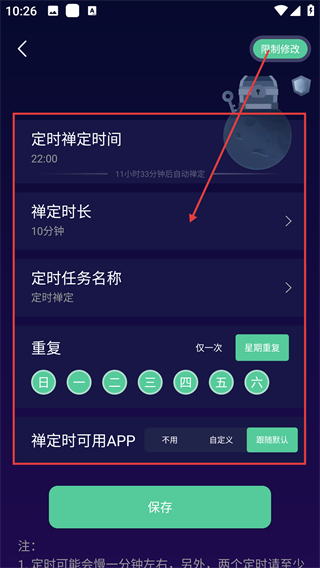 3、在定时配置页,可设置【定时禅定时间】【禅定时长】等参数,按需调整后就能保存啦。