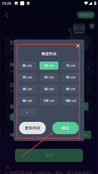 4、点【禅定时长】选项后,会弹出时长选择框,选对应时长再点【确定】就能设置好啦。