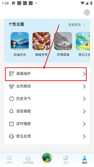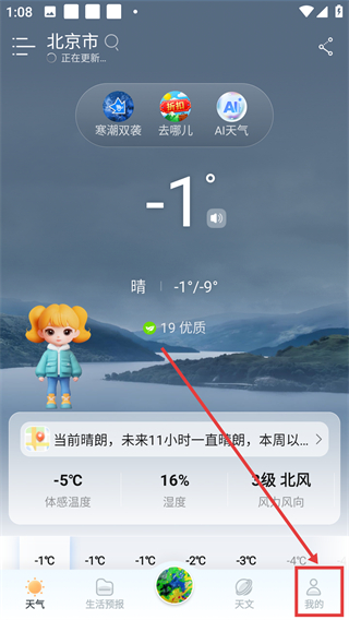 1、在天气主页面点击底部的【我的】选项,就能进入个人中心找到功能设置入口啦。