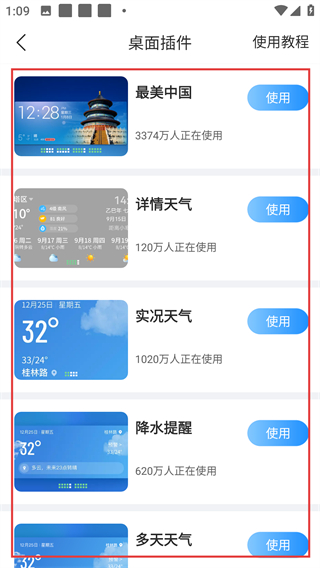 3、在桌面插件页,可看到【最美中国】【详情天气】等插件,选择喜欢的就能触发添加流程啦。