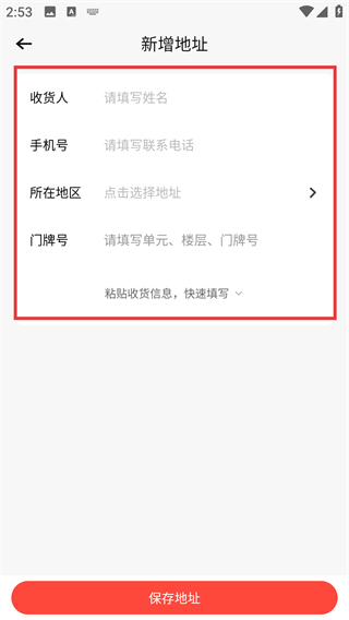 4、在新增地址页填写收货人、手机号等信息,填好后点击【保存地址】就能完成地址添加啦。