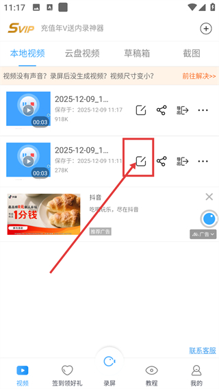 1、在本地视频列表找到目标视频,点击它的编辑按钮,就能进入视频编辑页面,准备给视频加音乐啦。