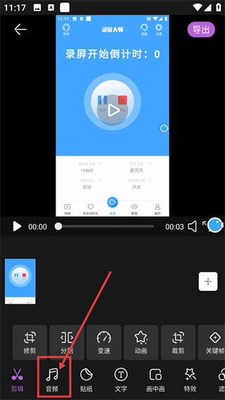 2、进入编辑页后点击底部的【音频】选项,就能打开音频操作面板,找到添加音乐的入口哦。