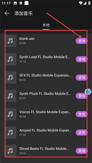 4、在本地音乐列表选好音频后点击【使用】,就能把这段音乐添加到当前编辑的视频里啦。