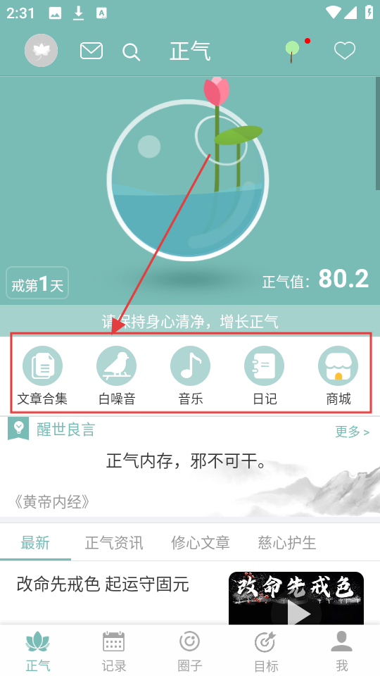 1、在应用主界面,有【文章合集】【白噪音】等功能按钮,点击对应按钮可进入相关功能页面使用功能。