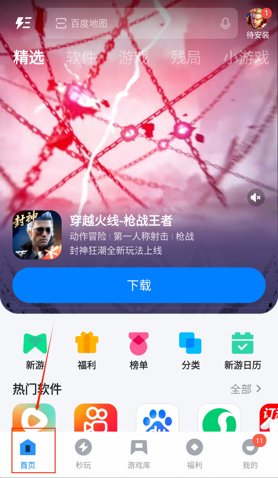 1、在本站下载安装应用宝app并打开,点击底部的“秒玩”进入秒玩频道