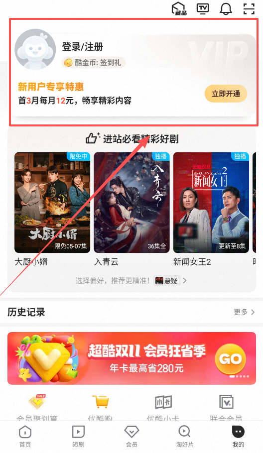 1、在本站下载安装运行优酷,会看到首页、发现、会员、星球、我的五大模块,找到会员选项。