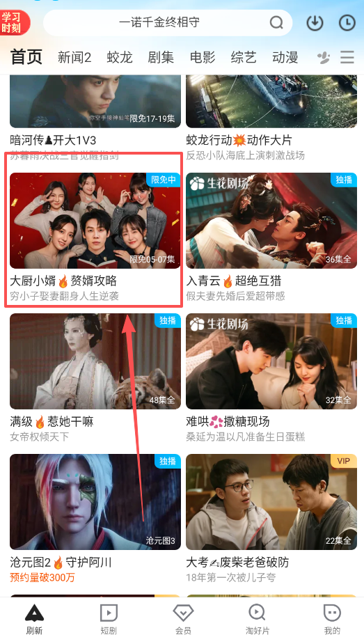 2、浏览首页的“限免中”区域,例如“少年初”和“大厨小婿”,这些剧集的指定集数正免费开放,可是省钱的好机会。