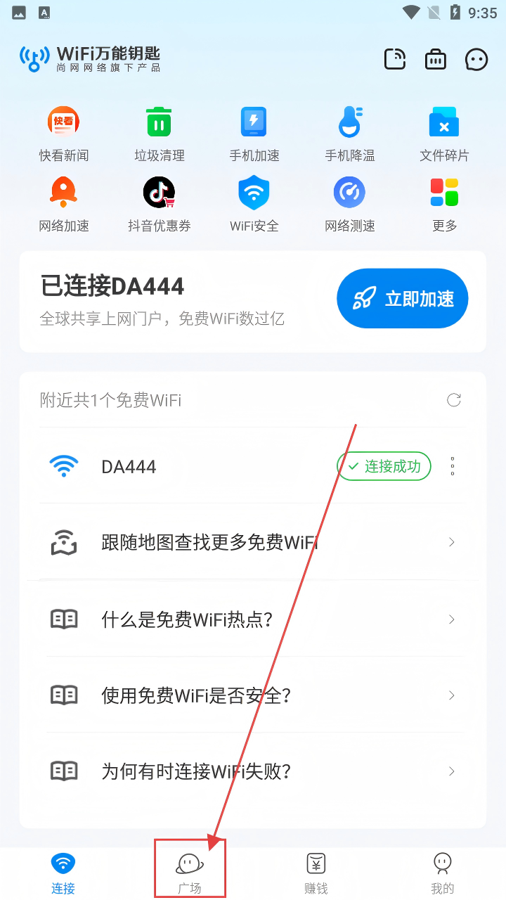 1、在WiFi万能钥匙主界面,点击底部【广场】按钮,就能进入广场页面,开启互动之旅啦。