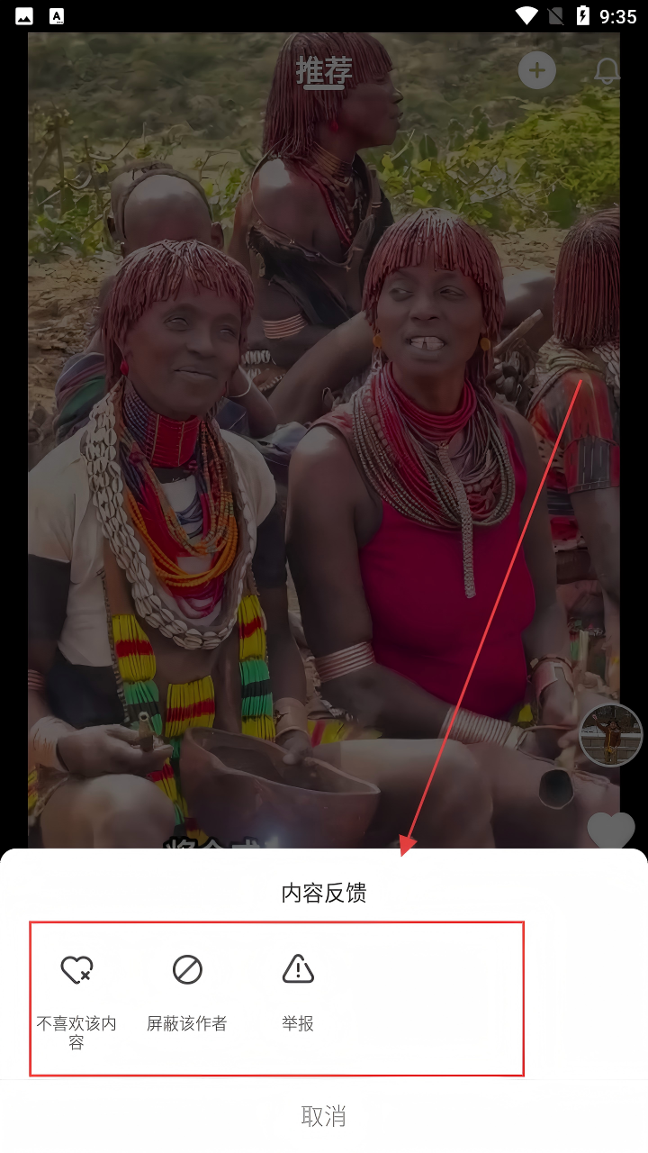 4、若对内容有反馈需求,点击相关反馈入口,可选择【不喜欢该内容】【屏蔽该作者】【举报】等操作哟。