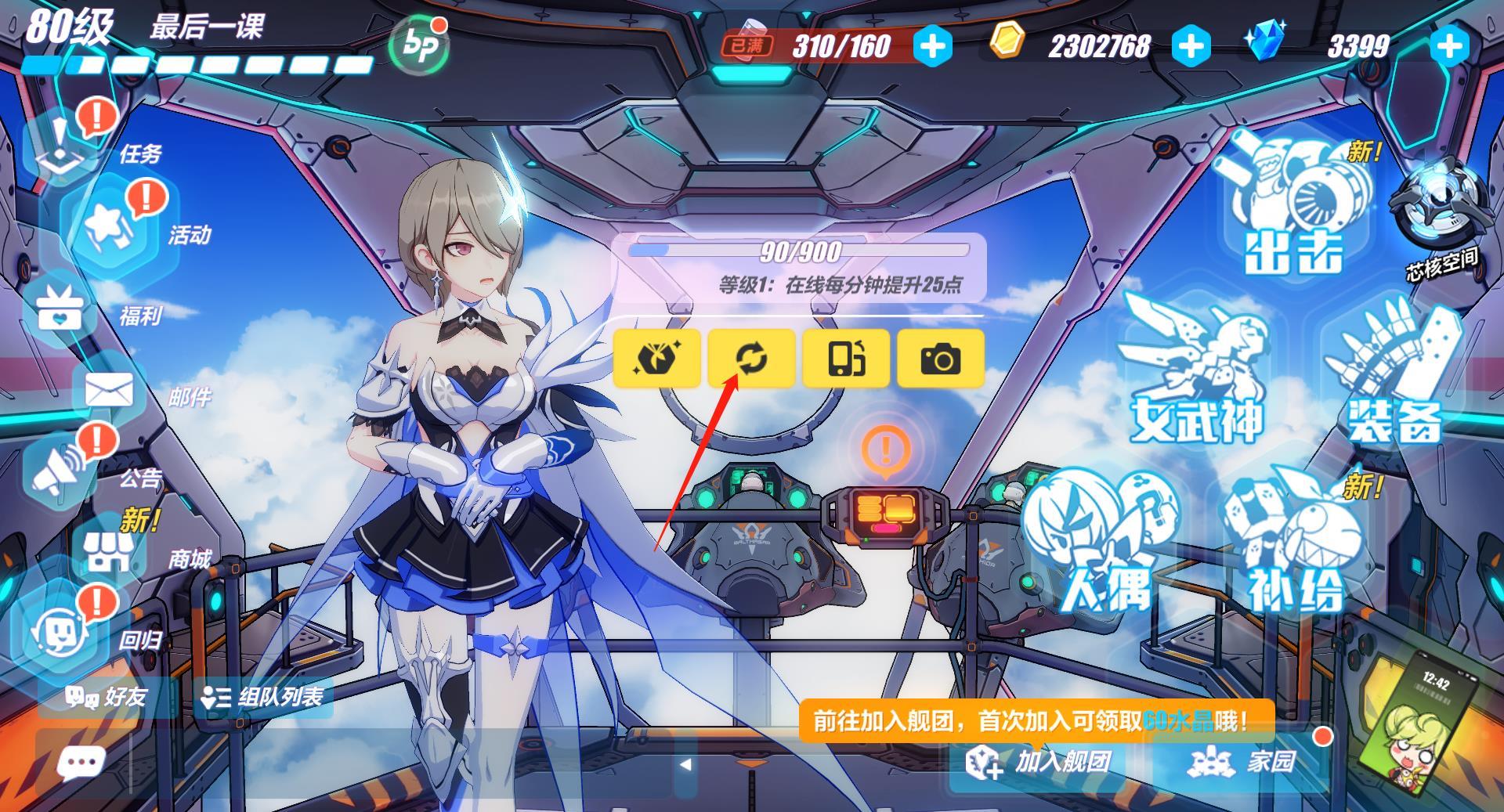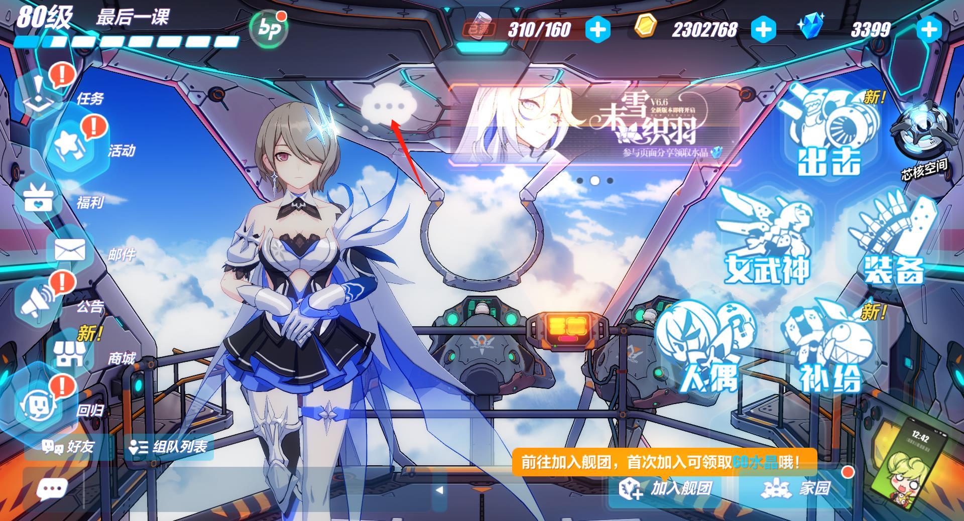1、当看到主页面的女武神头上出现白色聊天框时点击该聊天框,如果看到的是蓝色的话,只需点击一次蓝色聊天框 后等待女武神说完话就可以看到白色聊天框了。