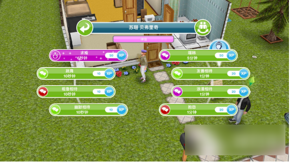 点击其中一方,在弹出的列表里选择【求婚】,再在求婚用品里选择戒指,接下来就完成求婚动作了。两位模拟市民达成了新关系:订婚伴侣。