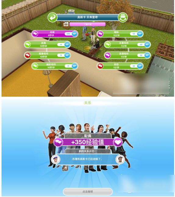 让一对新人多次浪漫相待直至订婚伴侣关系下出现结婚的选项。点击结婚按钮,6秒后就成功结婚啦!