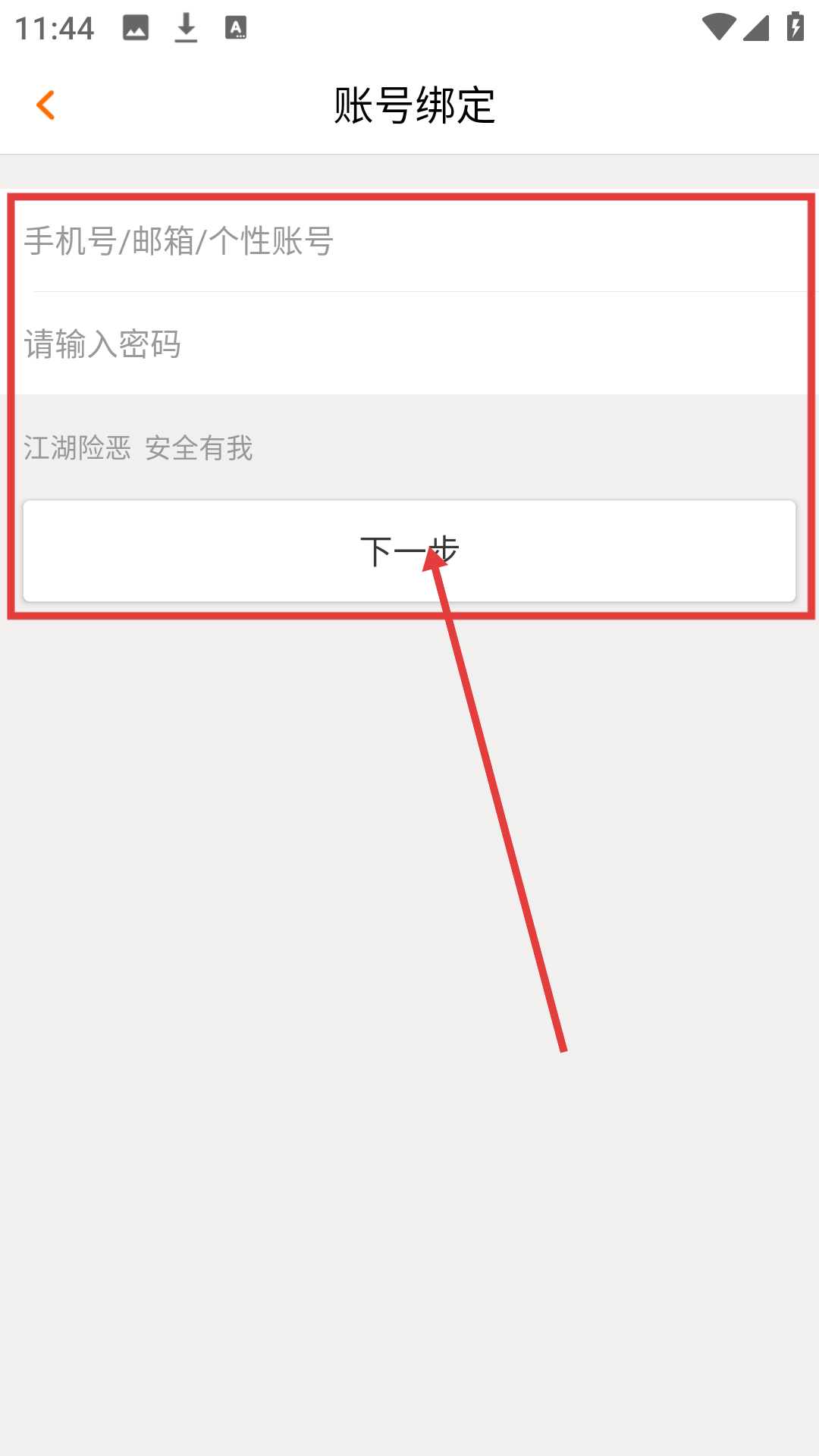 4、在账号绑定界面输入手机号/邮箱/个性账号和密码,点击【下一步】,完成账号绑定啦。