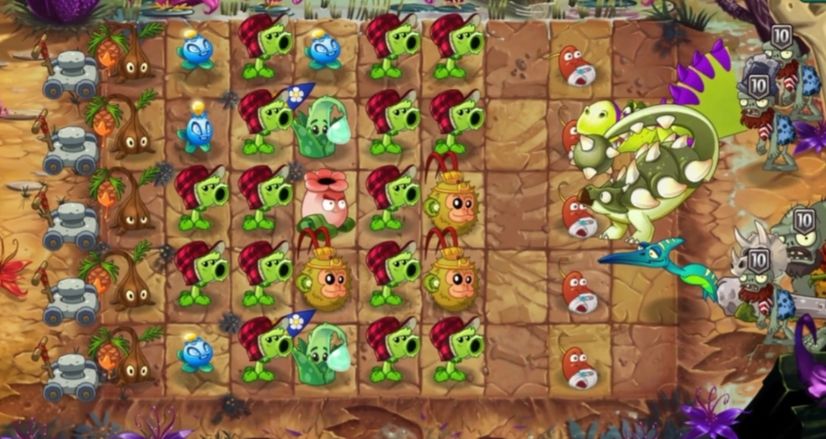 9.甲龙,在入场后,当有僵尸进入第九格时,甲龙将会挥动尾巴,将僵尸击至本行存在植物的最右列的同时将该植物击退一格。与该植物相邻的本行植物同样响应击退效果。当本行无植物时,甲龙可以把僵尸击至最远第二列的位置。挥动尾巴的动作进行5次后,或甲龙在场中停30秒后,它将离开。