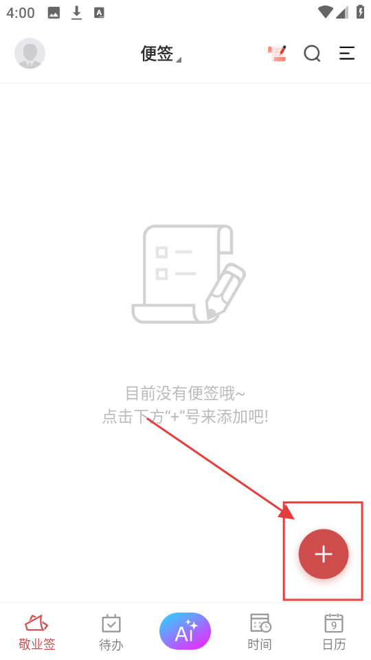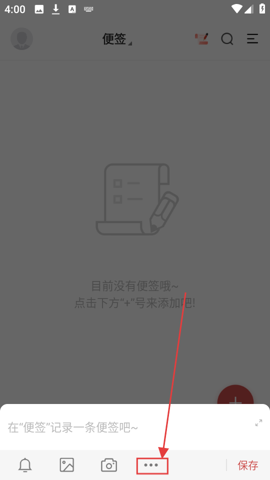 1、进入便签页面,看到提示“目前没有便签哦~点击下方‘+’号来添加吧!”,那就点击右下角红色【+】号,开始添加便签啦。