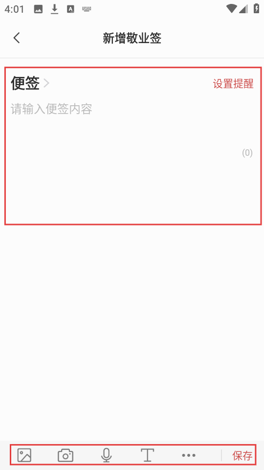 3、进入新增敬业签页面,在【便签】输入框里,输入要记录的内容,还能点击【设置提醒】,给便签设置提醒时间。