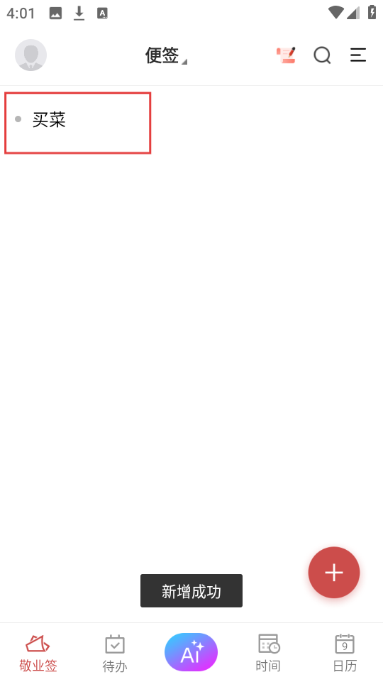 4、输入好便签内容,比如【买菜】,点击保存,就能看到便签成功添加在页面上,还会有“新增成功”的提示哦。