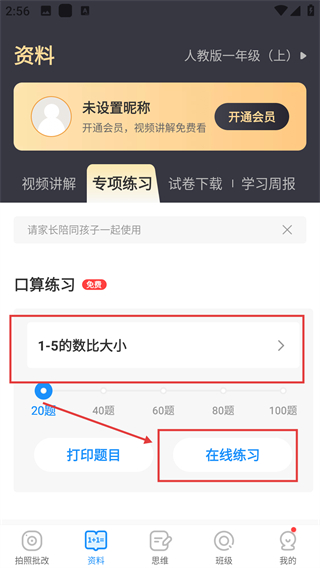 4、在专项练习标签页选好题目类型后,点击【在线练习】,就能开始对应的口算练习啦。