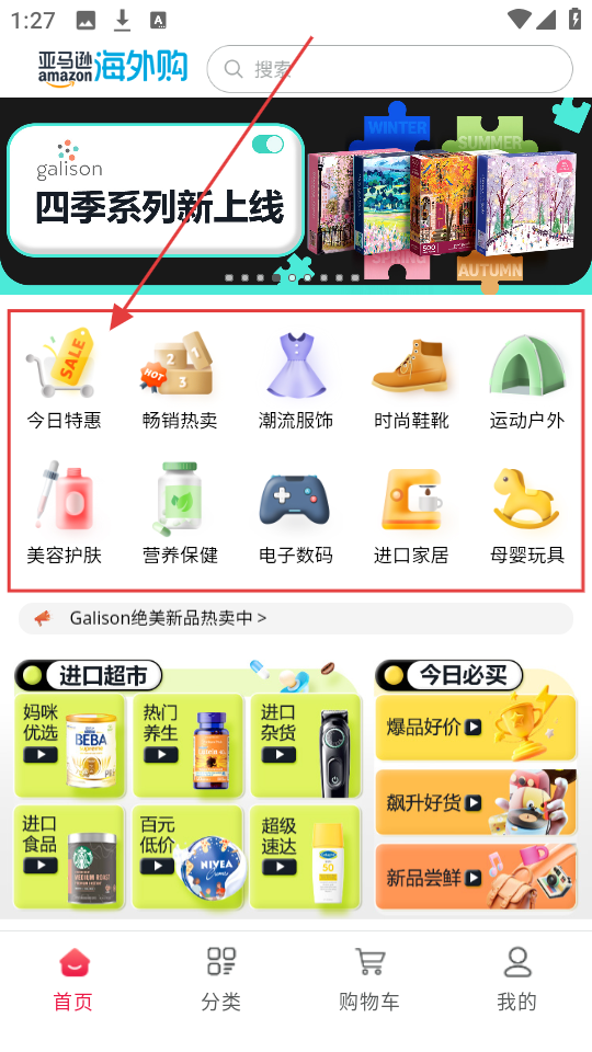 1、打开亚马逊海外购首页,能看到好多分类入口,咱们点击【今日特惠】,去瞧瞧有啥实惠好货呀。