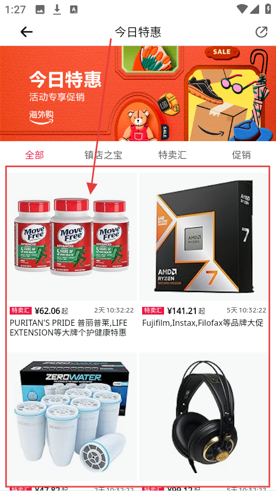 2、进入【今日特惠】页面,里面有各类特惠商品,咱们接着点击【特卖汇】,看看更多超值商品哟。