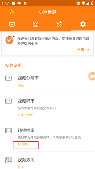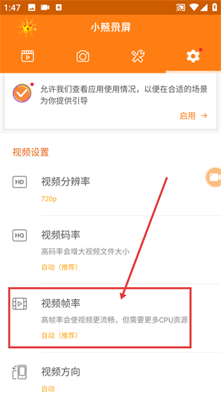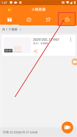 1、在小熊录屏首页点顶部设置按钮,能进入设置界面,后续可调整视频相关的配置参数啦。
