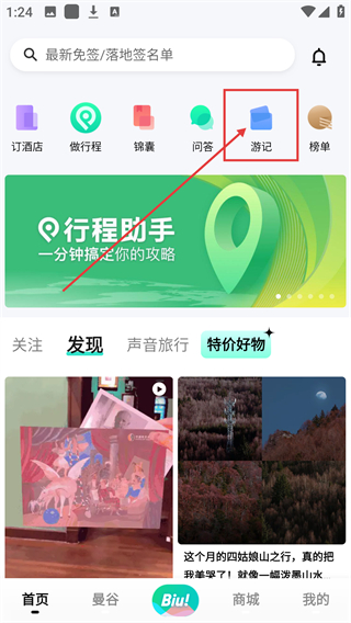 1、在应用首页,点【游记】选项能进入游记专区,查看各类旅行分享内容,找找出行灵感哦。