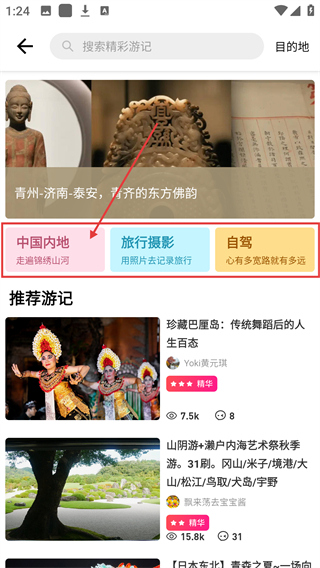 2、进入游记专区后,选【中国内地】分类,可看到国内各地的旅行游记,方便筛选对应区域的内容啦。