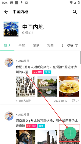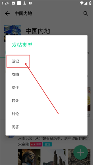 3、在“中国内地”游记页,点右下角的加号按钮,能打开发帖类型选择菜单,准备发布内容呢。