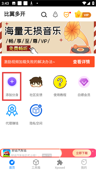 1、在【比翼多开】首页点击【添加分身】按钮,就能进入选择应用的页面,准备制作应用分身啦。