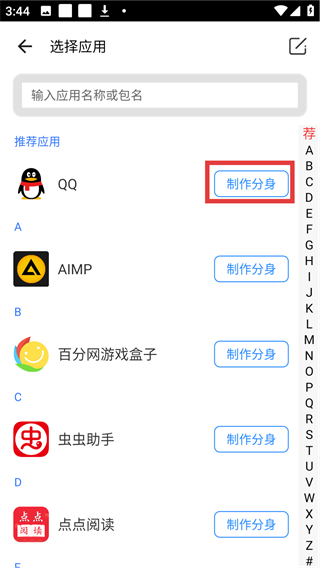 2、进入选择应用页后,找到目标应用(如【QQ】),点击右侧【制作分身】按钮就能进入分身配置页哦。