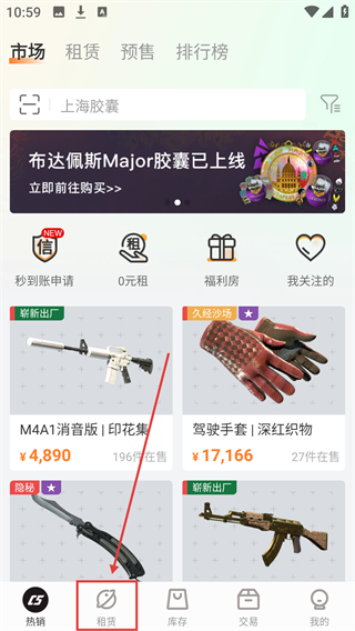 1、在C5GAME市场页,点底部【租赁】选项能进入租赁专区,查看可租赁的游戏道具资源哦。