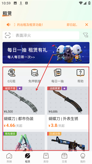 2、进入租赁页后,能看到各类可租赁的道具,选目标道具(比如蝴蝶刀)就能进入详情页啦。