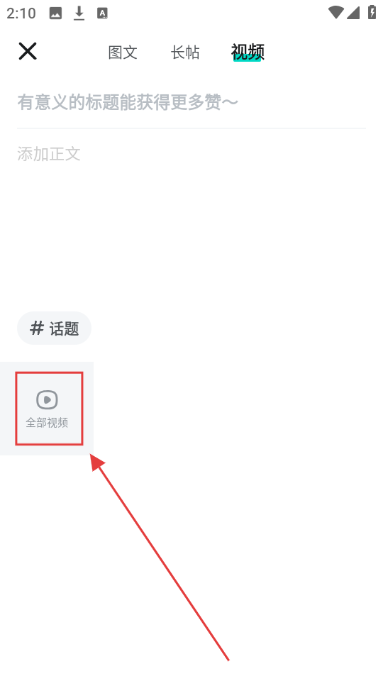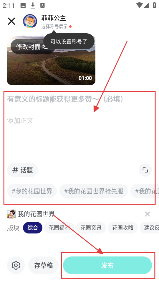 4、选好视频素材后,填写标题、正文,添加话题等,完成后点击【发布】,就能把视频内容分享出去啦。