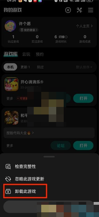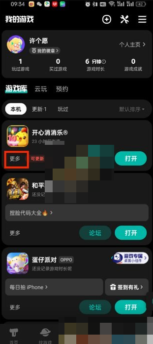 2、然后在我的游戏的页面中可以看到已下载的游戏,在这选好需要卸载的游戏后点击【更多】;