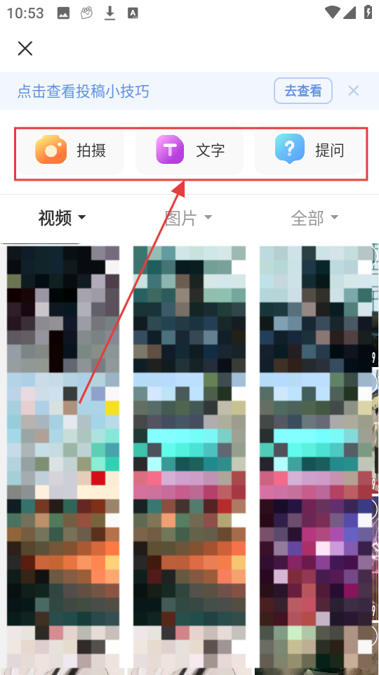 2、进入创作页面后,可选择【拍摄】【文字】【提问】等创作形式,按需选择即可啦。