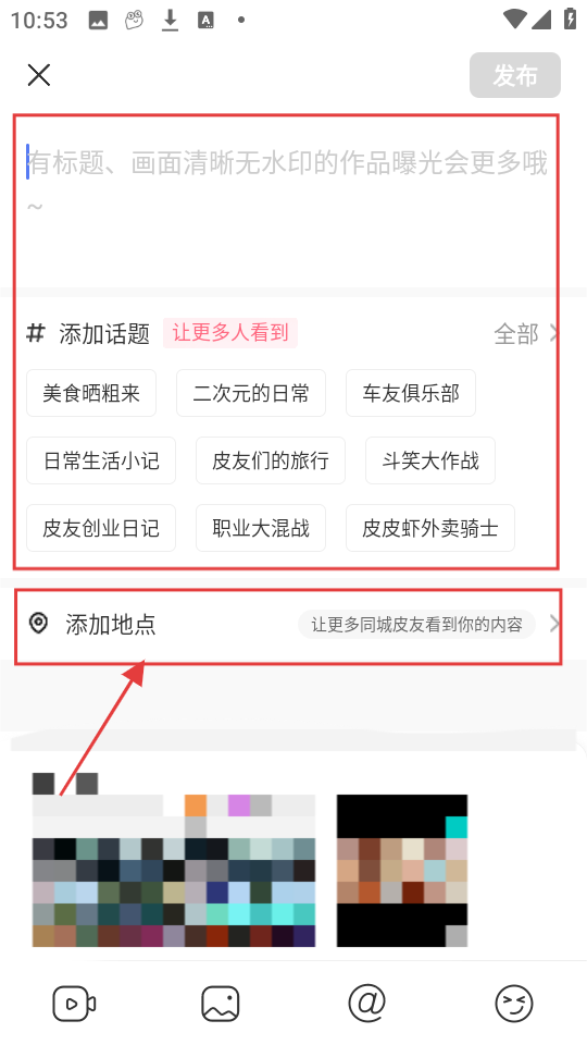 3、在创作编辑页面,可输入内容、添加话题,点击【添加地点】可进入位置选择页面哦。